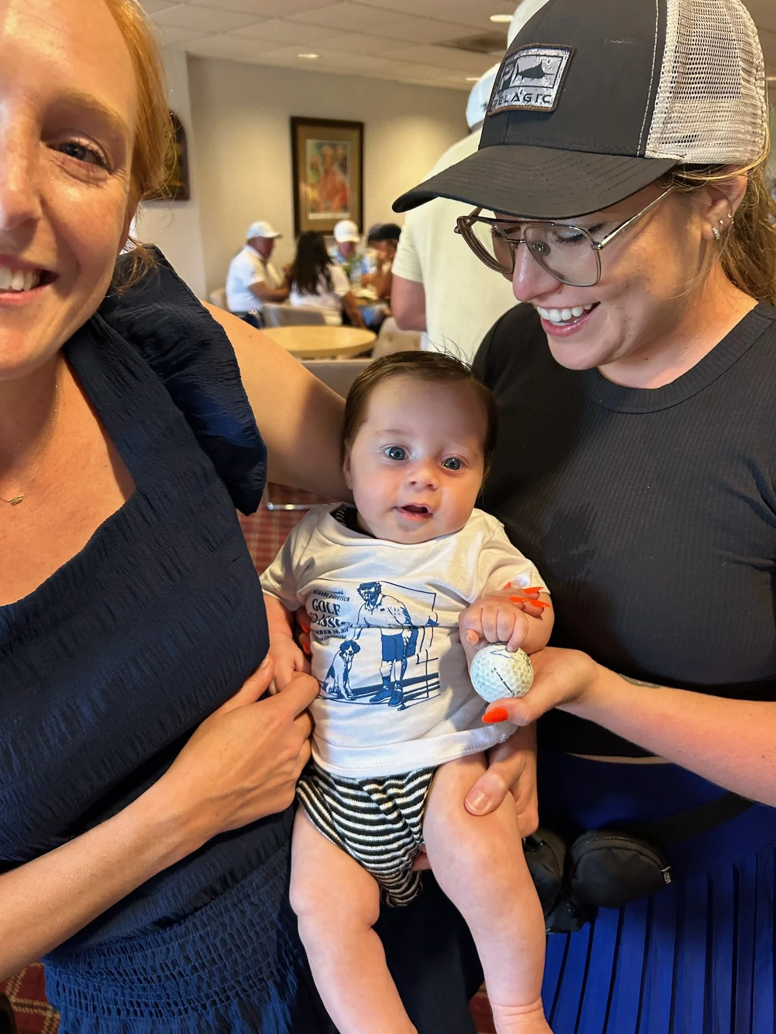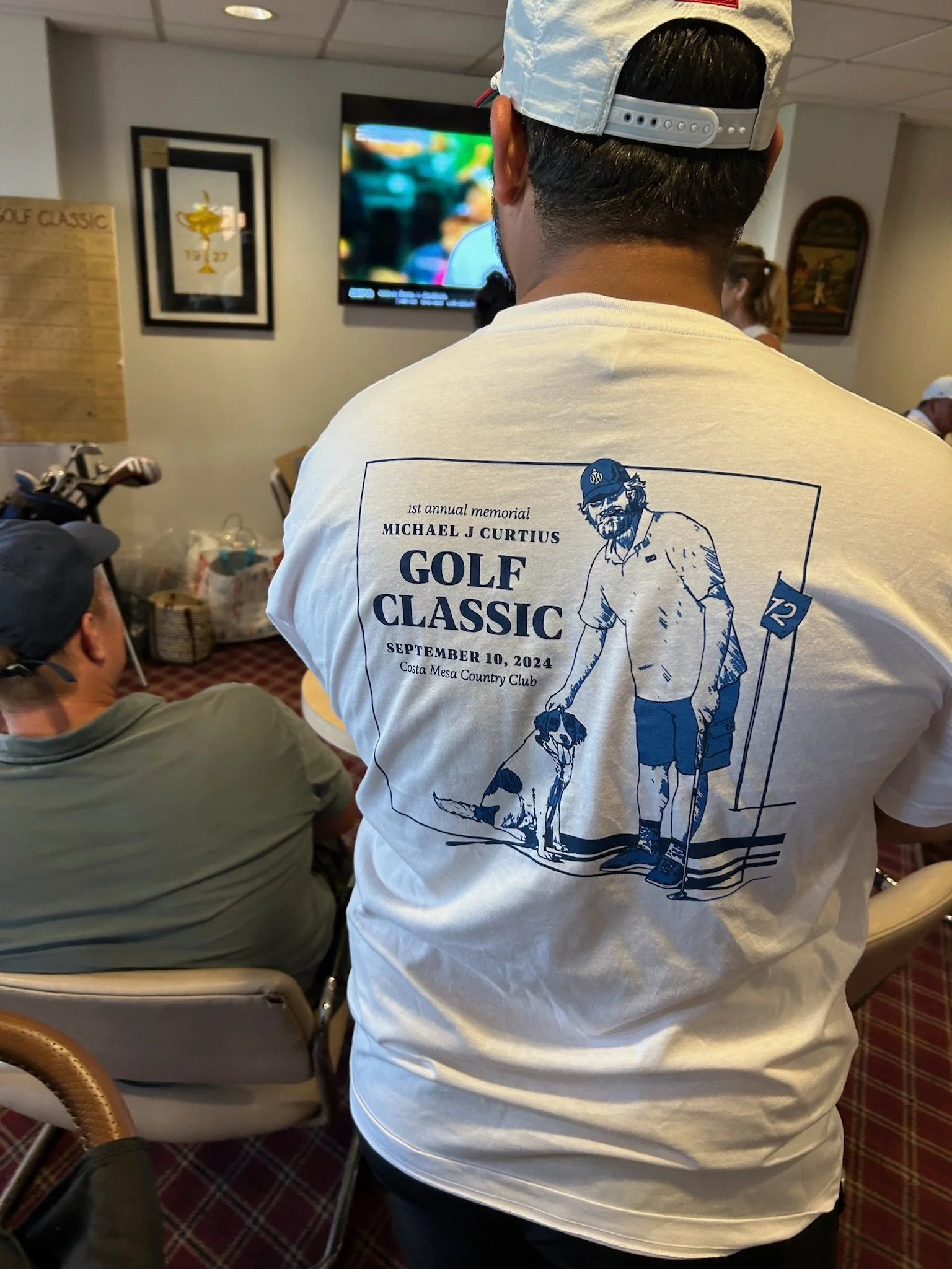 The invitation featured custom illustrations of the memorial’s namesake and his dog, rolling greens, and subtle personal details that paid tribute to the honoree, paired with elegant yet sporty typography that set the tone for the event. These hand-drawn elements extended to the event welcome signs, creating a cohesive and visually engaging experience throughout the course. Koozies were designed with the illustration, adding a functional keepsake for attendees, while custom screen-printed T-shirts blended illustration and typography for a wearable tribute that participants could take home.